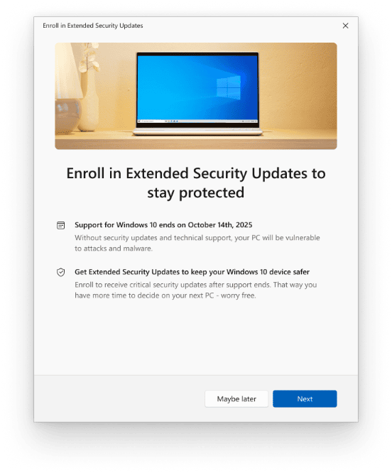 El programa ESU permitirá que los usuarios que aun tengan PCs con Windows 10 sigan recibiendo actualizaciones de seguridad importantes y críticas a través de un servicio de suscripción anual una vez finalizado el soporte.
